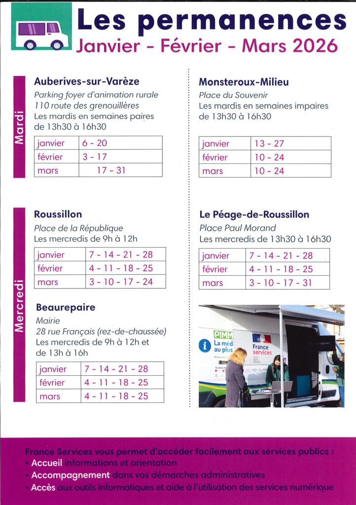 Vous trouverez ci-après tous les lieux et horaires des permanences du Bus France Services, de janvier à mars 2026 :