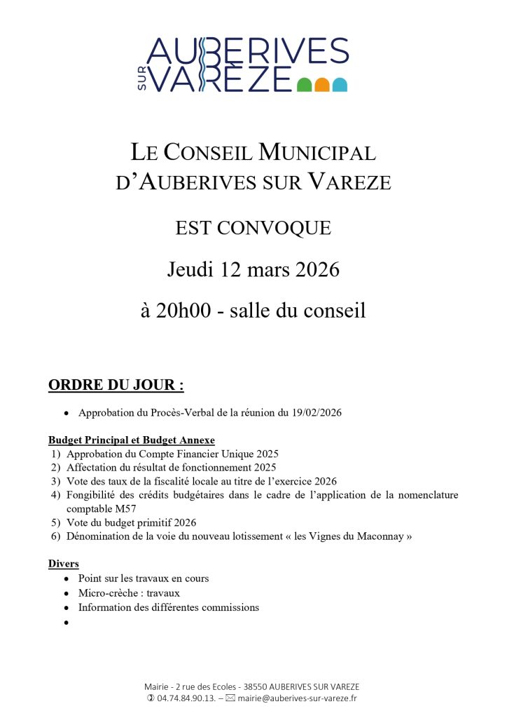 Le Conseil Municipal se réunira jeudi 12 mars 2026 à 20h00, salle du conseil.